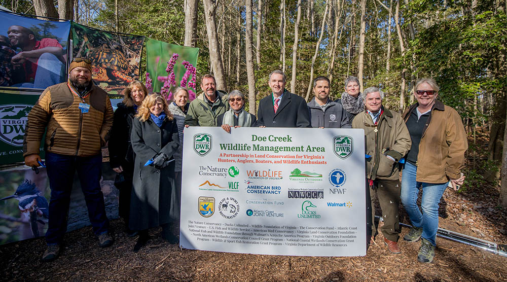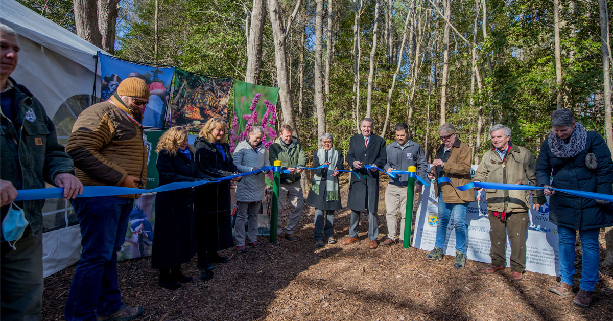 الحاكم رالف نورثام (في الوسط) يقص الشريط خلال حفل تدشين إضافة إلى منطقة إدارة الحياة البرية في دو كريك التابعة لـ DWR التي جاءت كجزء من مبادرة الحفاظ على غابات الشاطئ الشرقي التابعة لـ DWR.