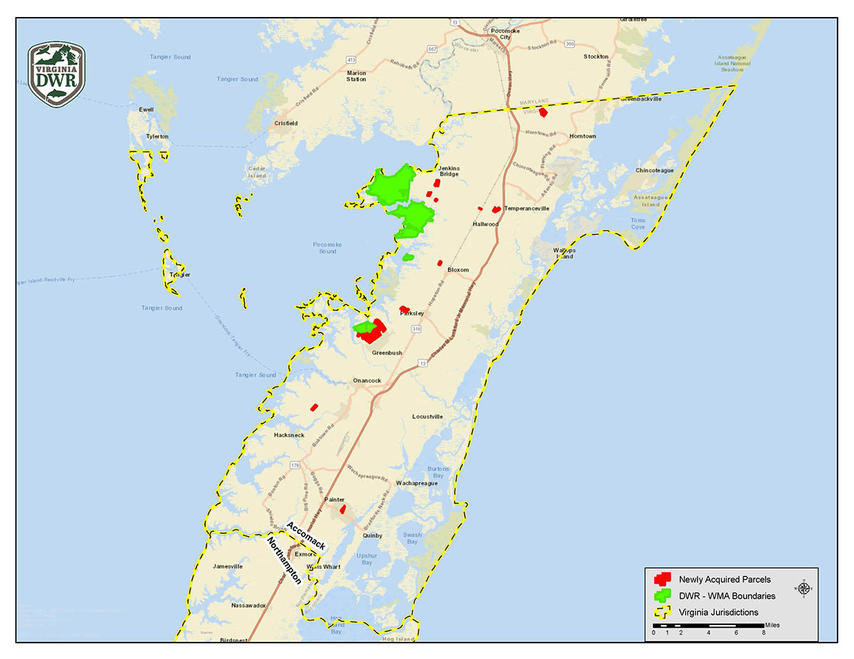 تقوم إدارة موارد الحياة البرية في فيرجينيا (DWR) بشراء أرض على الشاطئ الشرقي لفيرجينيا كواحدة من أهم جهود الحفظ التي قامت بها هناك. عند اكتمال هذه المبادرة، ستعمل هذه المبادرة على تحسين موطن الحياة البرية بشكل كبير، وتوفر إمكانية وصول عامة مرغوبة للغاية على مساحة تزيد عن 8 ،600 فدان، وتدعم المرونة الساحلية. وسيستفيد من هذا العمل أكثر من 60 من أنواع الحياة البرية ذات الأولوية المعرضة للخطر، إلى جانب مئات الأنواع الأخرى من الحياة البرية والنباتات الموجودة في هذه القطع. لن تؤدي إضافة هذه 8 ،654 فدان في 65 الطرود الفريدة من نوعها إلى إنشاء ممر للمحافظة على البيئة عبر مقاطعة أكوماك إلى مقاطعة نورثهامبتون لتوفير موطن للحياة البرية الآن وفي المستقبل فحسب، بل ستخلق أيضًا فرصًا واسعة النطاق للترفيه المعتمد على الحياة البرية، مثل مشاهدة الحياة البرية والصيد.