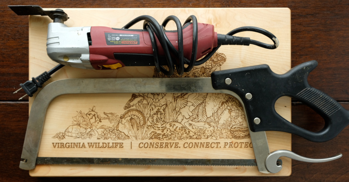 يعمل منشار تقطيع اللحم بشكل أفضل، ولكن معظمنا لا يملك واحداً من هذه المناشير في مطبخه أو مرآبه. تعمل المناشير والمناشير العظمية بشكل جيد، وكذلك المنشار ذو الشفرة ذات الأسنان الرفيعة، ولكن هذه المناشير تعمل بشكل أفضل عندما يكون هناك مجموعة ثانية من الأيدي المتاحة لتثبيت كل شيء. أفضل استخدام أداة متذبذبة ذات شفرة ذات أسنان دقيقة. يتيح لي ذلك تشغيل المنشار بيد واحدة وإمساك اللحم على اللوح باليد الأخرى.