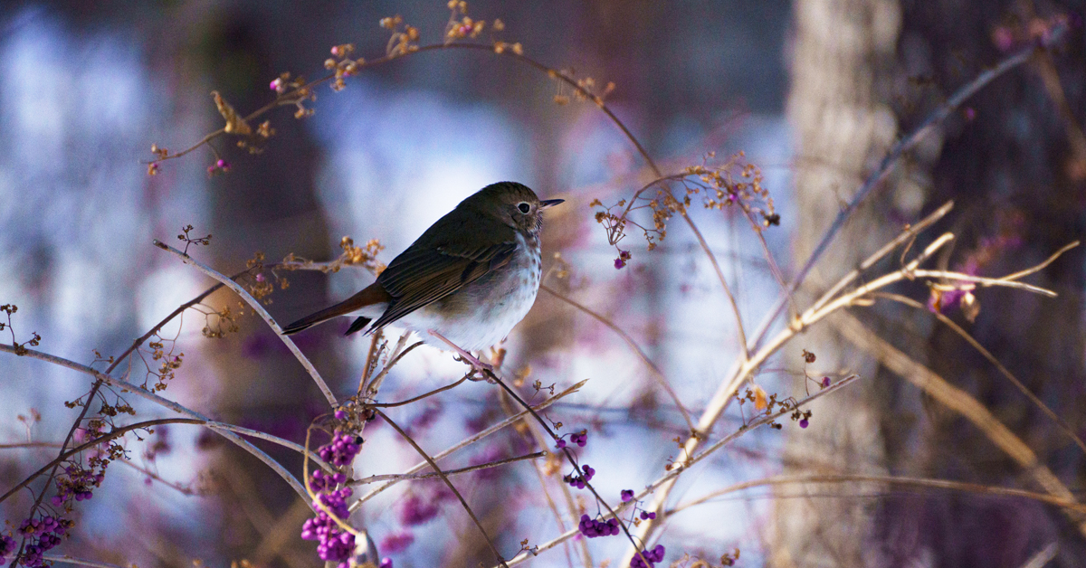 طائر طائر القنفذ الناسك الذي يطفو على ثمرة توت بري أمريكي، شوهد في موقع إديث ج. كارير للمشتل والحدائق النباتية في موقع VBWT.