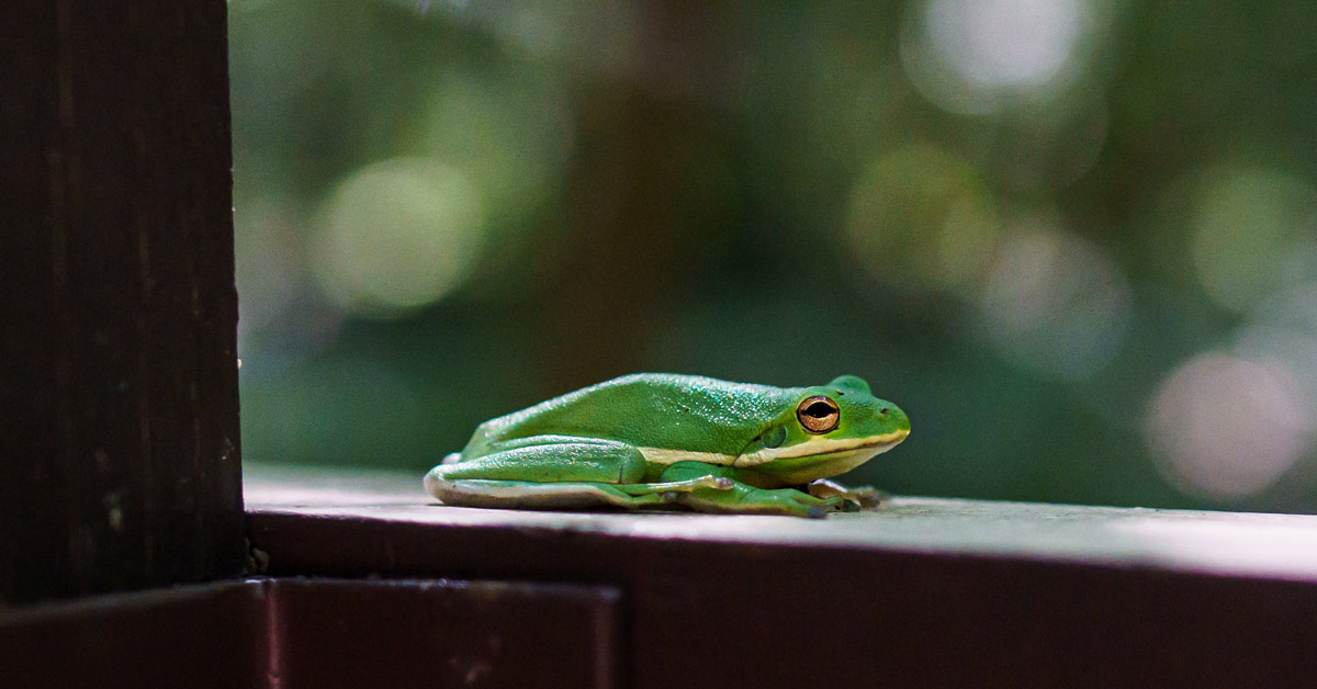 ضفدع الشجرة الخضراء يجد الضوء في حديقة نيوبورت نيوز.