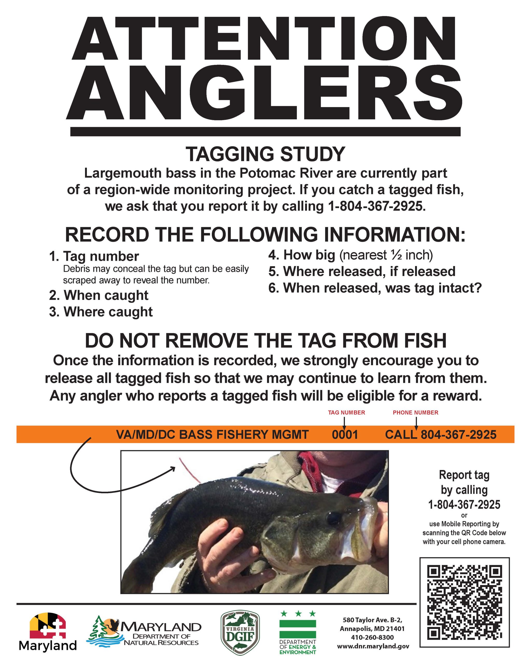 سيتم اصطياد أسماك القاروس الكبير في موائل المياه العذبة المتأثرة بالمد والجزر في نهر بوتوماك من خلال مسوحات الصيد الكهربائي ثم قياسها ووزنها ووسمها وإطلاقها. يمكن للصيادين الذين يصطادون سمكة موسومة أن يبلغوا عن رقم الوسم وتاريخ الصيد وحجم السمكة ومواقع الصيد والإفراج عنها. سيتم إدخال الصيادين الذين يبلغون عن اصطياد سمكة موسومة في قرعة سنوية للحصول على جائزة. يمكنهم الاتصال على البريد الإلكتروني 804-367-2925 أو البريد الإلكتروني basstag@dwr.virginia.gov لترك المعلومات.