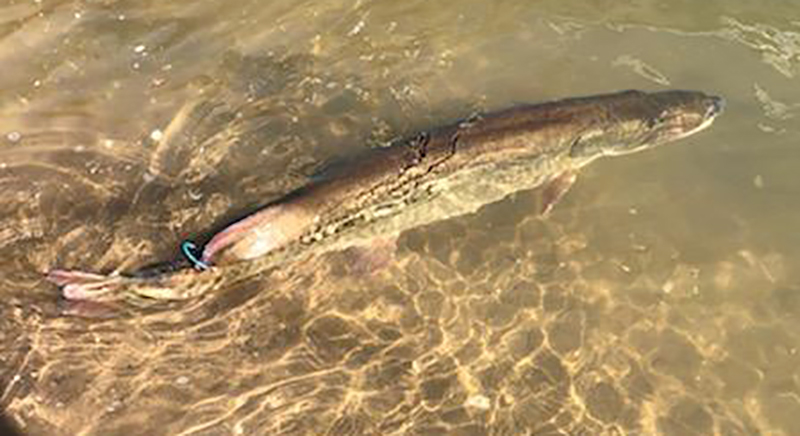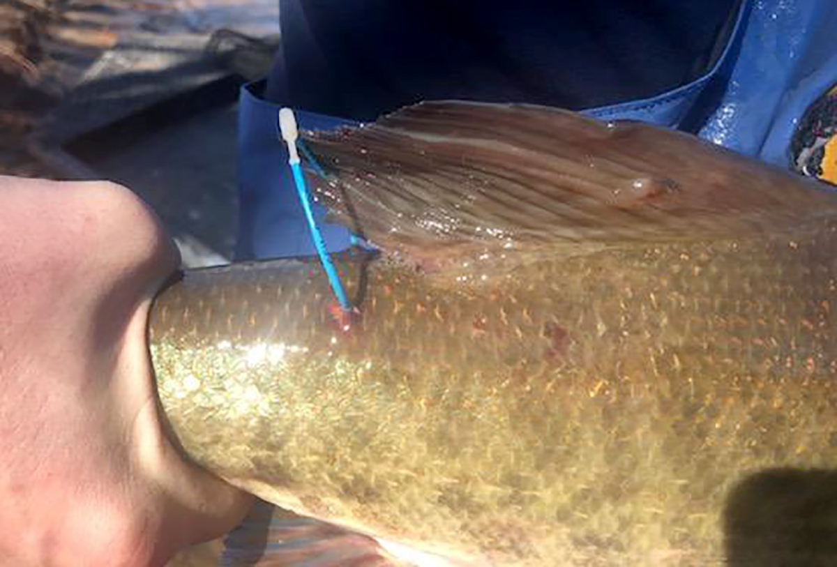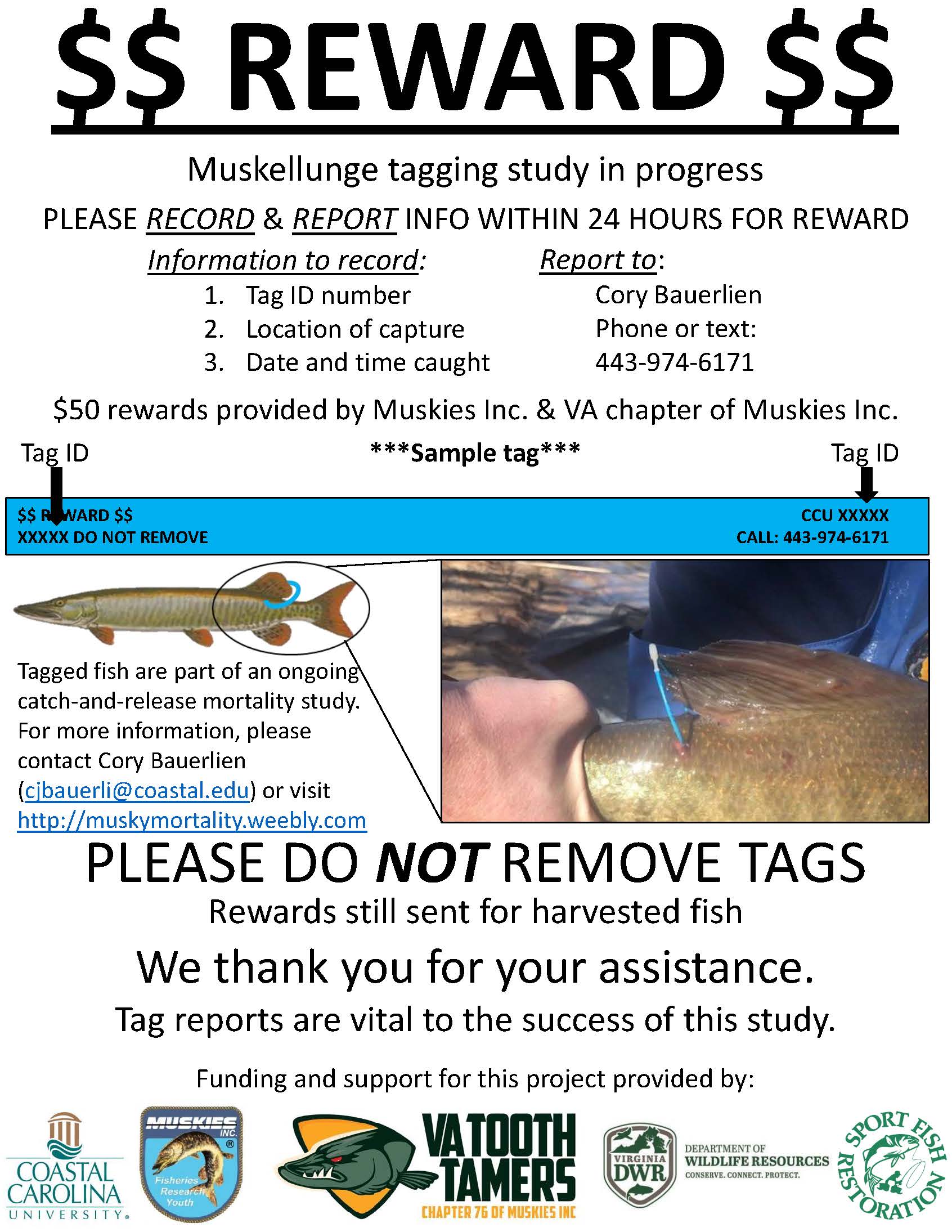يمكن للصيادين الذين يصطادون سمكة موسومة أن يبلغوا كوري باورلين من جامعة كارولينا الساحلية عن العلامة عبر الهاتف أو رسالة نصية على 443-974-6171 في غضون 24 ساعة مقابل مكافأة قدرها50 دولار أمريكي. لمزيد من المعلومات، انظر https://muskymortality.weebly.com/.