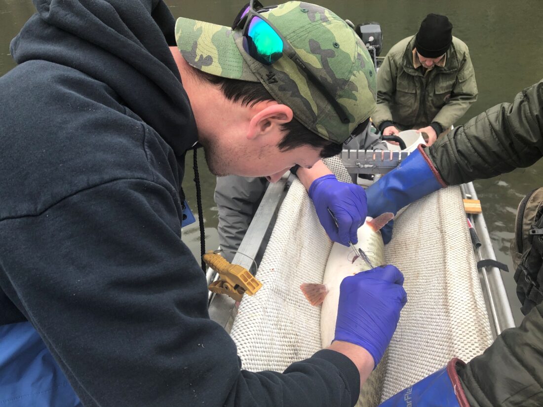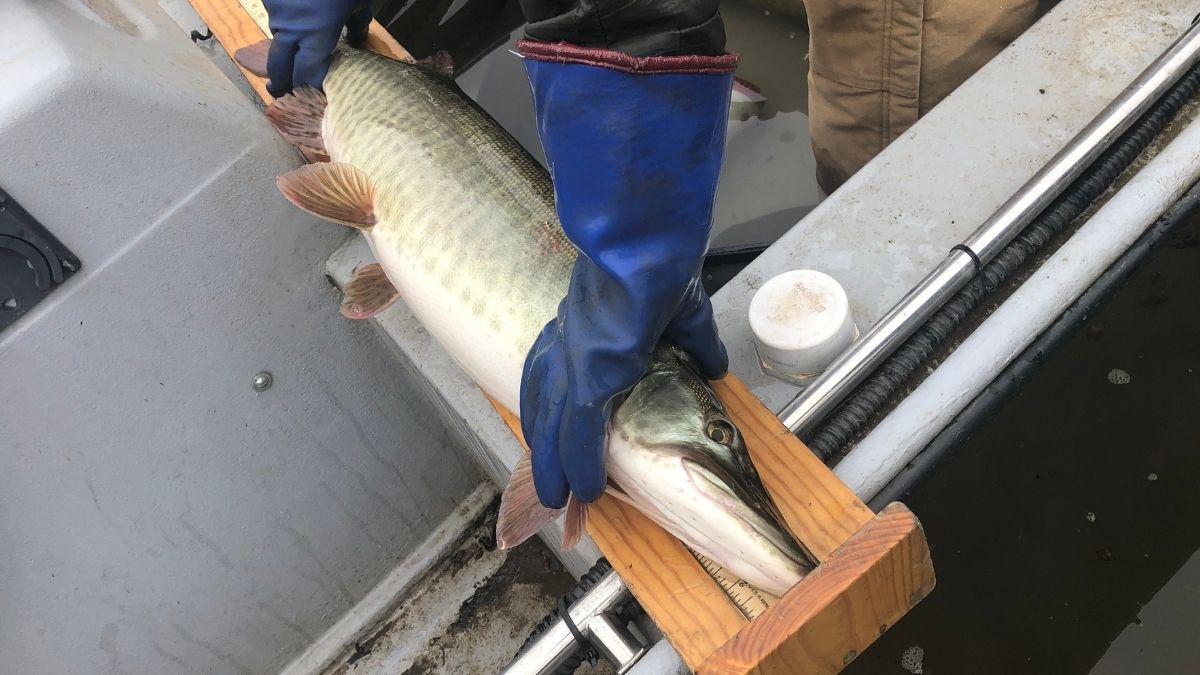 زرع الباحثون جراحيًا أسماك المسكليونج التي يتراوح طولها بين 26 و 46 بوصة بعلامات لاسلكية مشفرة بشكل فردي في فبراير-مارس من 2020 (N = 45) و 2021 (N = 50) حتى نتمكن من تتبع ورصد مصائر جميع الأسماك الموسومة. كما قمنا أيضًا بإرفاق علامات خارجية حلقية بالأسماك الموسومة بالراديو حتى يتمكن أي شخص يصطاد سمكة موسومة بالراديو من الإبلاغ عنها والحصول على مكافأة قدرها50 دولار أمريكي.
