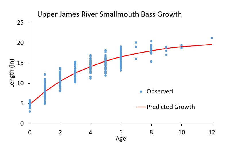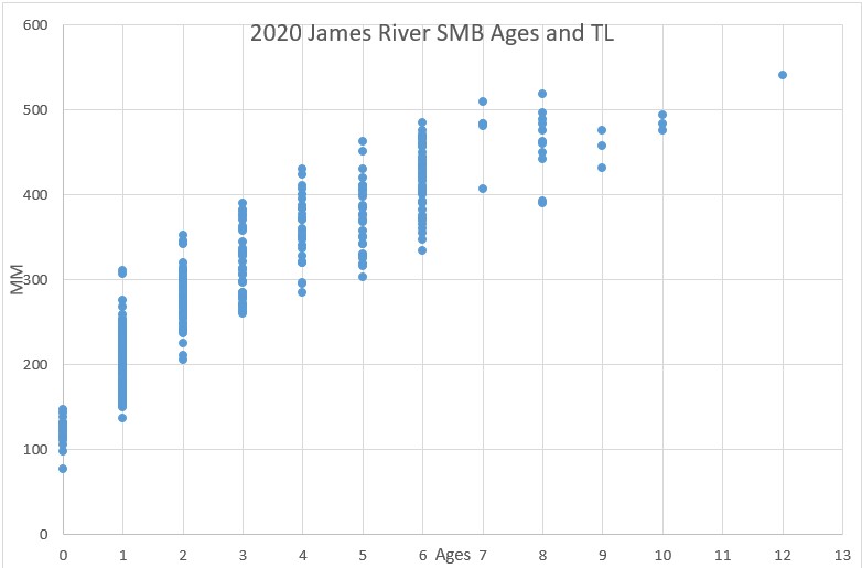 علماء الأحياء: أظهرت أحدث بياناتنا عن العمر والنمو (2020) من أعالي جيمس أن متوسط عمر 3 القاروس 317 ملم، أو 12 بوصة. انظر الرسم البياني أدناه. هذا نمو أسرع مما رأيناه 10-15 منذ سنوات، ولكننا لسنا متأكدين تمامًا من السبب. يمكن للأفراد ذوي النمو السريع أن يصلوا إلى 12″ في العمر 2 وفي حالات نادرة في العمر 1 ولكن متوسط الأسماك يصل إلى هذا الحجم في العمر 3. زيادة النمو بالنسبة للعينات التاريخية هو نتاج عدد من العوامل التي من المحتمل أن تشمل انخفاض الوفرة وانخفاض المنافسة.