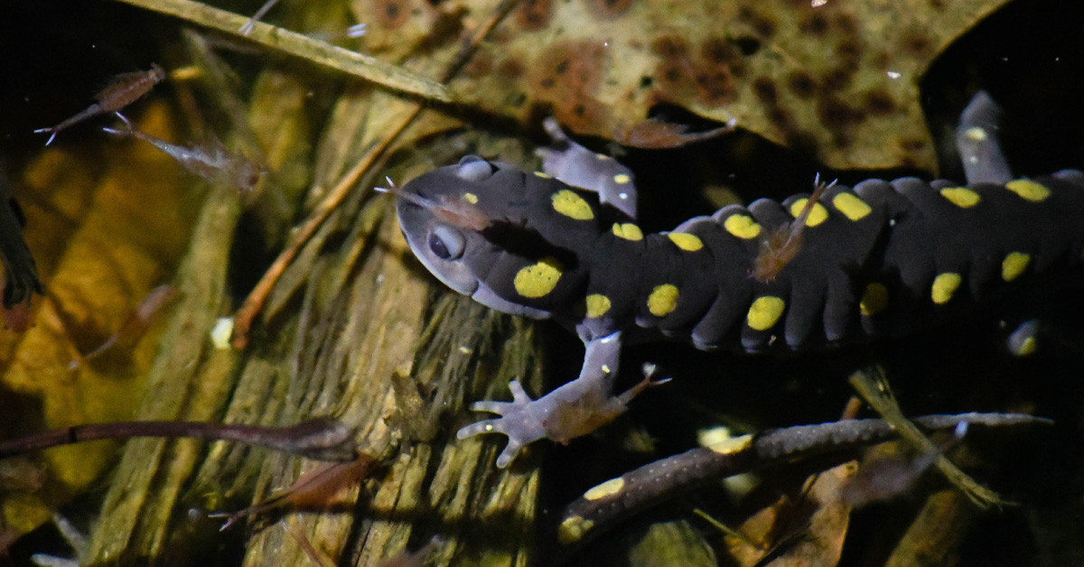 على بعد عدة أقدام من حافة الحوض، التقط شعاع المصباح الأمامي شخصًا في الطريق، وكانت عيناه السوداوان تلمعان، وهي علامة إيجابية. كشفت نظرة سريعة على حوض السباحة عن المزيد. تتلوى مئات من حيوانات السلمندر المرقط(Ambystoma maculatum) الصامتة ولكن اللافتة للنظر، وهي تتلوى حول الحطام الخشبي والعشب المغمور بالمياه وبعضها البعض في الليل. وهي سلمندرات كبيرة الحجم، تصل أطوالها إلى ستة إلى 10 بوصة، مع ظهور سوداء حليبية مرصعة ببقع صفراء لامعة، وبطون تنحدر إلى الرمادي عن طريق الأرجواني، مما يجعل من السهل اكتشافها. اجتمع الجميع للمشاركة في واحدة من أهم الليالي في عامهم.