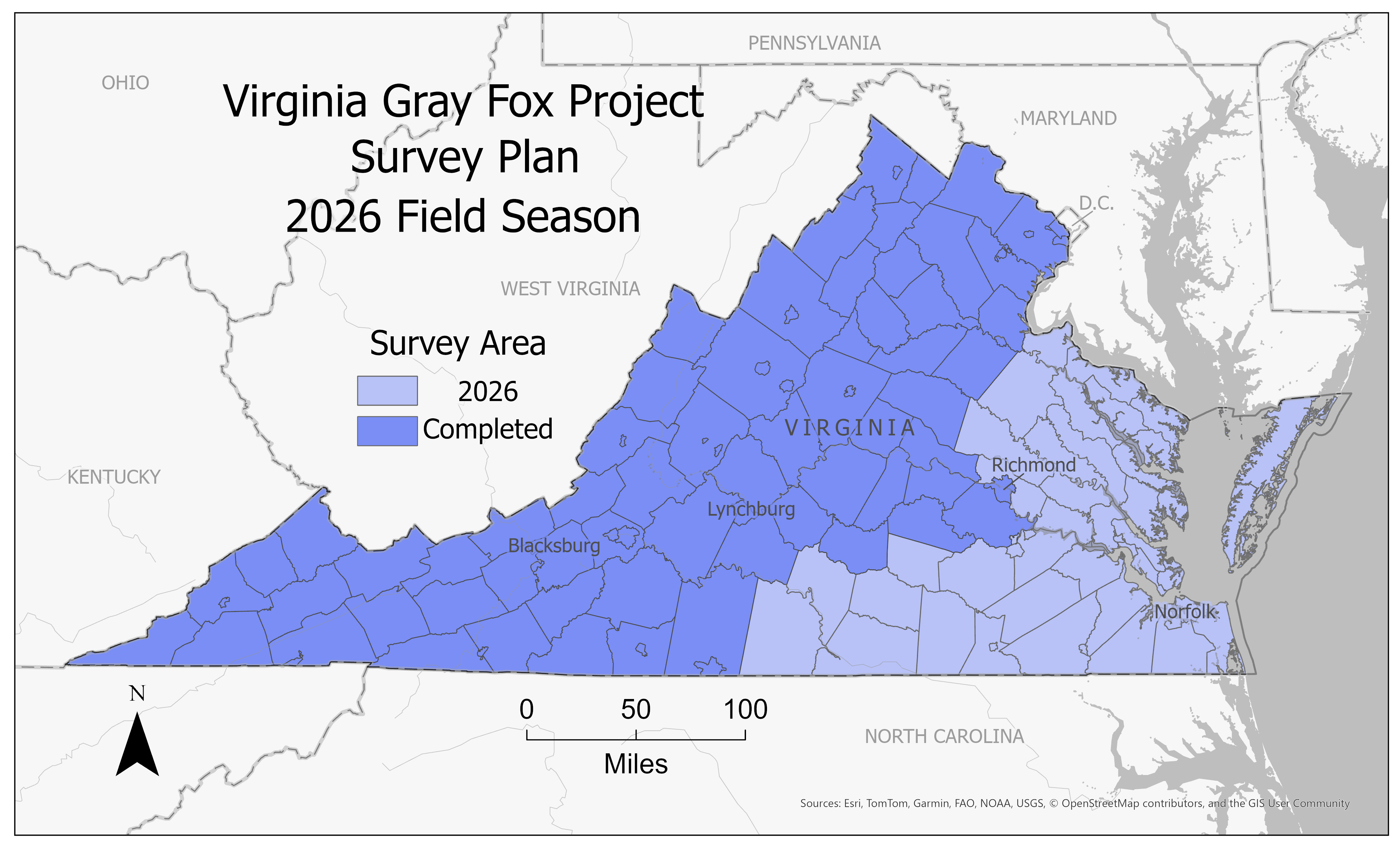 سيحصل المشروع الذي يستمر لمدة ثلاث سنوات على بيانات عن أعداد الثعلب الرمادي، إلى جانب الحياة البرية الأخرى، في جميع أنحاء الولاية. في 2024 ، ركز الباحثون على المقاطعات الغربية في ولاية فرجينيا، حيث قاموا بوضع كاميرات المشروع في 425 موقعًا، مع كاميرات إضافية 38 تم تركيبها من قبل ملاك الأراضي المشاركين. في 2025، ركز فريق البحث على منطقة بيدمونت، ووضع الكاميرات في مواقع 492 ، مع كاميرات 71 إضافية تم إعدادها من قبل ملاك الأراضي المشاركين. في 2026، سيغطي الفريق المقاطعات المتبقية في منطقة مخطط بيدمونت الساحلي الجنوبي الأوسط والجنوب الشرقي (بما في ذلك الشاطئ الشرقي). يبحث المشروع عن مشاركة ملاك الأراضي في هذه المناطق.