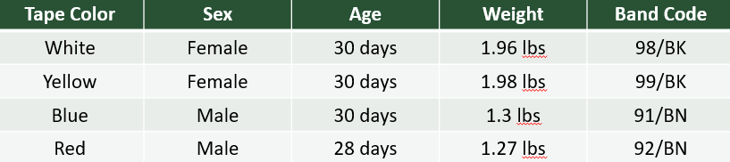 على غرار السنوات الثلاث الماضية، تتألف الحضنة 2024 من نسبة جنس مثالية 50/50 مع ذكرين وأنثيين. يتم تحديد جنس الصقر عند وضع النطاقات، حيث أن الإناث لديها أرجل أكبر وبالتالي تحصل على نطاقات أكبر مقارنة بالذكور. حصل كل كتكوت على شريط فيدرالي على الساق اليمنى مع شريط ملون مؤقت ملصق على هذا الشريط لمساعدة علماء الأحياء على تتبع الكتاكيت بعد أن تفرخ. يجب أن يسقط هذا الشريط اللاصق بشكل طبيعي في غضون أسابيع قليلة. بالإضافة إلى شرائطهم الفيدرالية، حصل كل كتكوت على شريط أسود "قابل للقراءة في الميدان" فوق شريط أخضر. وأخيراً، تم وزن كل كتكوت وقياس وتر الجناح (قياس تشريحي لجناح الطائر).