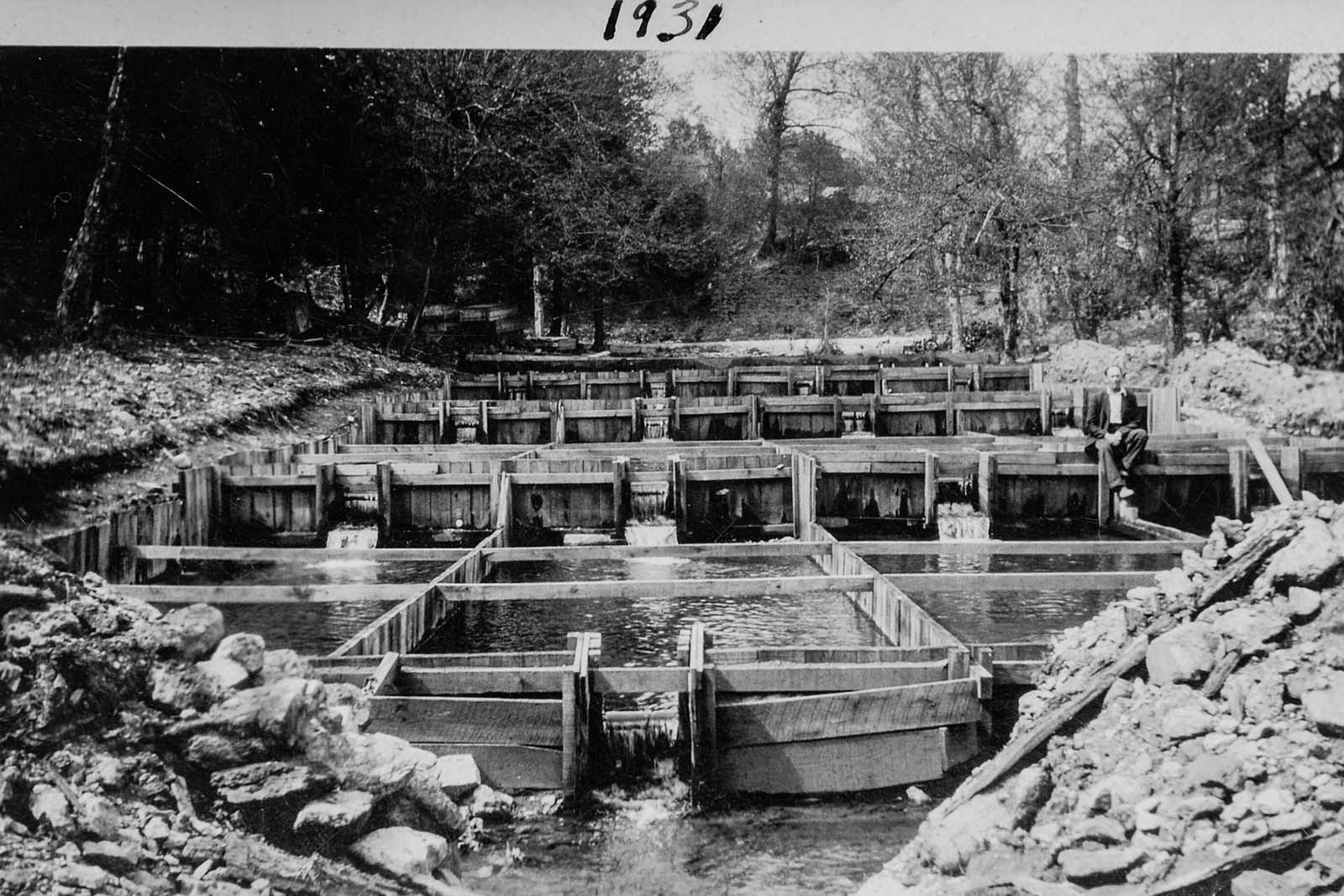 يتم تغذية مفرخ أسماك مونتيبيلو بالربيع، مع إمكانات الضخ من الخور أسفل المنشأة عند الحاجة إلى فائض المياه. كان المرفق الأصلي يحتوي على مجاري مائية ذات جوانب ونهايات خشبية (معظمها من الكستناء الأمريكي). في وقت لاحق، في أوائل 1950s، تم استبدال المجاري المائية الترابية والخشبية بمجاري مائية خرسانية في صف واحد. يحتاج هذا التصميم إلى كمية أقل من المياه للتشغيل.