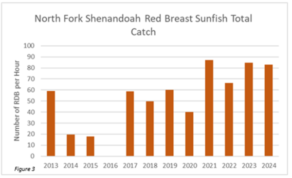 هناك قصة نجاح أخرى لسمك شيناندواه تتمثل في أسماك الشمس، وتحديداً سمك الشمس الأحمر الصدر. بعد انخفاض في عدد السكان لمدة ثماني سنوات من 2013-2021 ، انتعش عدد السكان بشكل جيد (الشكل 2). على مدى السنوات الثلاث الماضية شهدنا معدلات صيد أعلى من المتوسط على المدى الطويل، وهذه ليست أسماك دينكس، 76 في المائة من صيدنا يقاس >6 بوصة في الطول. لا توجد فرصة لصيد طعم يحاكي جراد البحر في هذا النهر.
