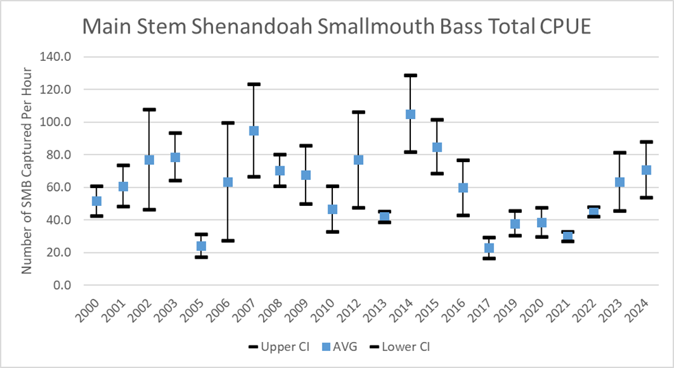 انخفضت أعداد سمك القاروس الصغير في وسط نهر جيمس (من بنت كريك إلى واتكينز لاندينج) في السنوات الأخيرة. كشفت عينات الصيد الكهربائي في الخريف 2024 عن علامات متواضعة على التحسن. تم جمع ما مجموعه 616 سمك القاروس الصغير في 2024 ، حيث كان 86 في المائة من تلك الأسماك يقل قياسها عن 12 بوصة. كشفت عينات الخريف 2024 عن وجود أعداد لا بأس بها من سمك القاروس الصغير 1- سنة 5-6 بوصة تقريبًا. ستصل هذه الأسماك إلى حجم يمكن اصطيادها في 2025 وينبغي أن توفر للصيادين بعض الإثارة في جميع أنحاء النهر الأوسط على مدى السنوات العديدة القادمة. يبدو أن انخفاض وفرة سمك القاروس الصغير الفموي قد أدى إلى زيادة معدلات النمو. تنمو الأسماك المتبقية في النهر الأوسط بسرعة كبيرة وينبغي أن توفر فرصًا متواضعة لصيد أسماك عالية الجودة في السنوات القادمة.