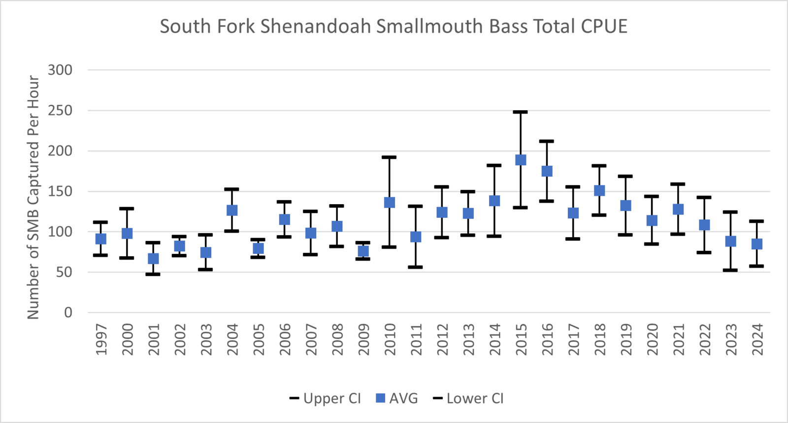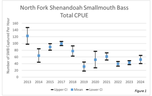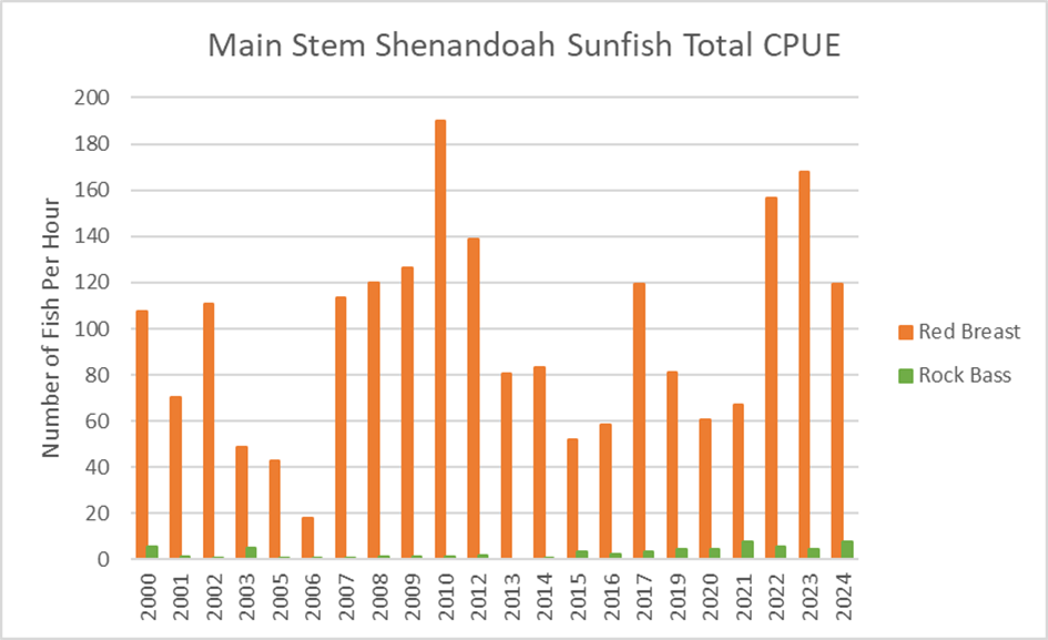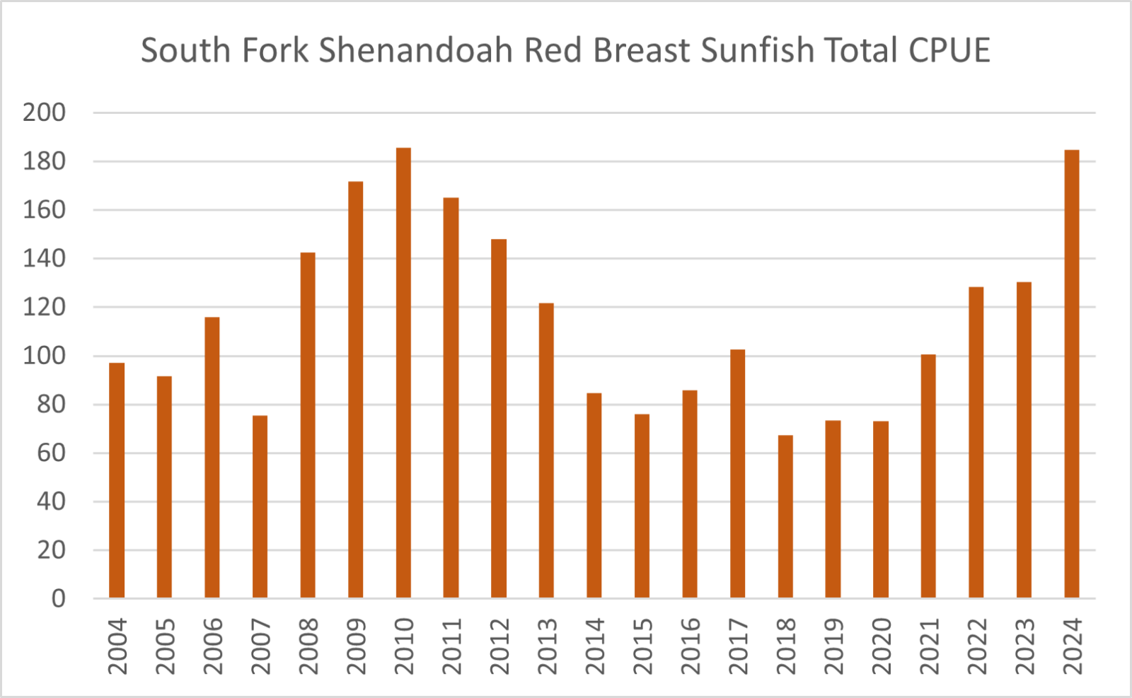 يُعرف الصيادون نهر ساوث فورك شيناندواه بأنه مصايد "الأعداد"، مما يعني أنه يمكن للصيادين أن يتوقعوا صيد كمية معقولة من سمك القاروس وسمك الشمس في أي يوم معين. خلال أخذ عينات الخريف 2024 جمعنا 710 سمك القاروس الصغير من تسعة مواقع للعينات بمعدل 85 سمكة في الساعة (الشكل 1). 26 وبلغت نسبة 11 بوصة بوصة أو أكثر، وتجاوزت 6 في المئة 14 بوصة و 1 في المئة 17 بوصة فأكثر. كان معدل الصيد لدينا مطابقًا تقريبًا لعينة 2023 ومنخفضًا قليلًا عن المتوسط طويل الأجل. على الرغم من الانخفاض الأخير في معدل الصيد، إلا أن أعداد السمك تبدو مواتية، مع وجود أعداد جيدة من الأسماك عالية الجودة. وبشكل عام، أسفرت عينتنا عن أعداد كبيرة من 8-11 بوصة من صغار الفئران الصغيرة الحجم، وهي نتيجة مباشرة لتكاثرها فوق المتوسط في 2021. هذا أمر معتاد جدًا بالنسبة للشوكة الجنوبية، معدلات صيد رائعة مع انخفاض أعداد الأسماك ذات الحجم الجيد. ستتحسن معدلات الصيد الحالية لدينا إذا شهدنا تكاثرًا أعلى من المتوسط في 2025. على مدى العامين الماضيين كان لدينا نجاح منخفض للغاية في التفريخ بسبب ظروف الجفاف. تواجه صغار السمك الصغير وقتاً عصيباً في التجنيد عندما يكون لدينا ارتفاع شديد في المياه أثناء التكاثر في الربيع، أو الجفاف الشديد خلال فصل الصيف. نأمل أن يكون لدينا طقس أكثر ملاءمة في العام القادم للمساعدة في زيادة عدد السكان.