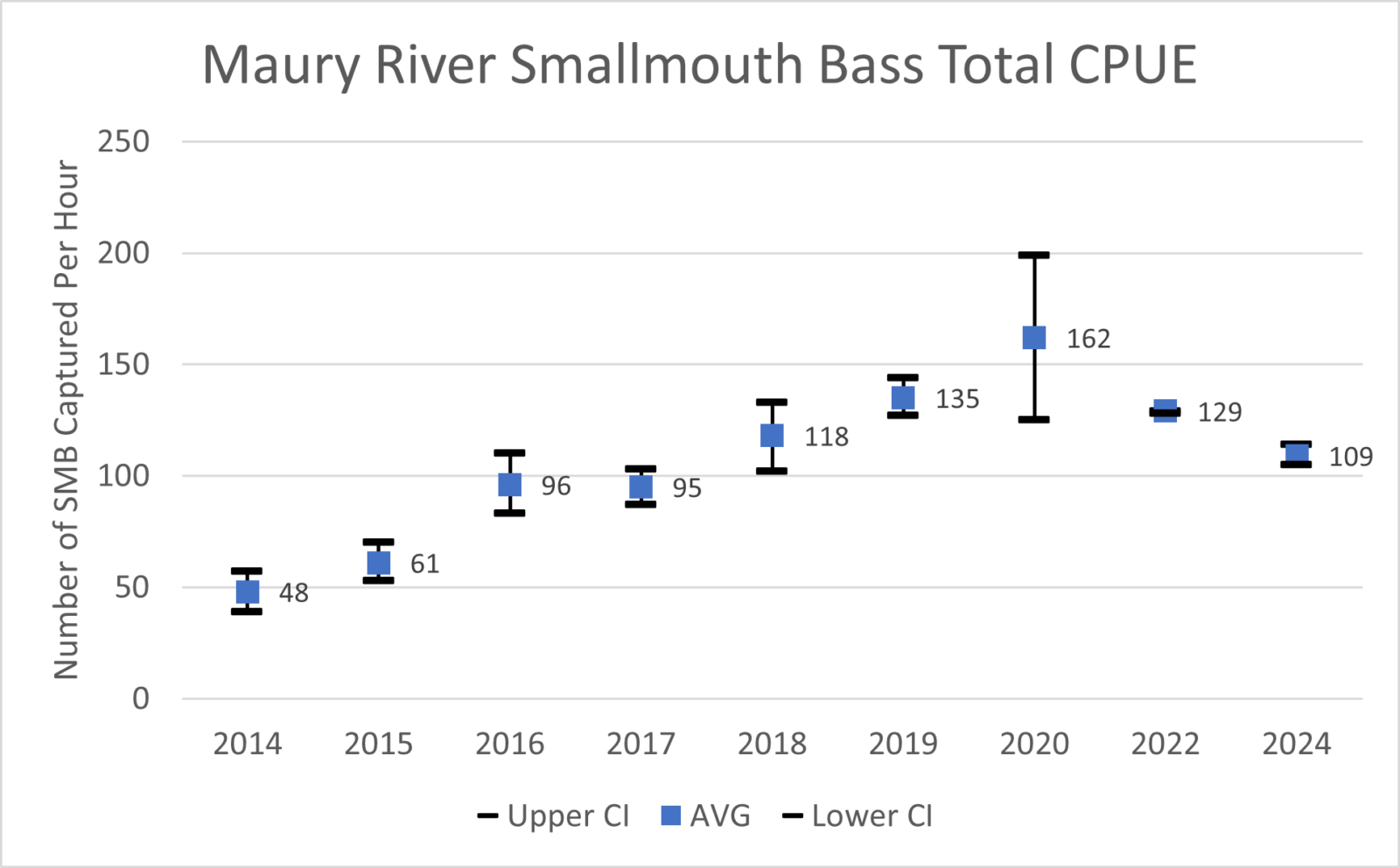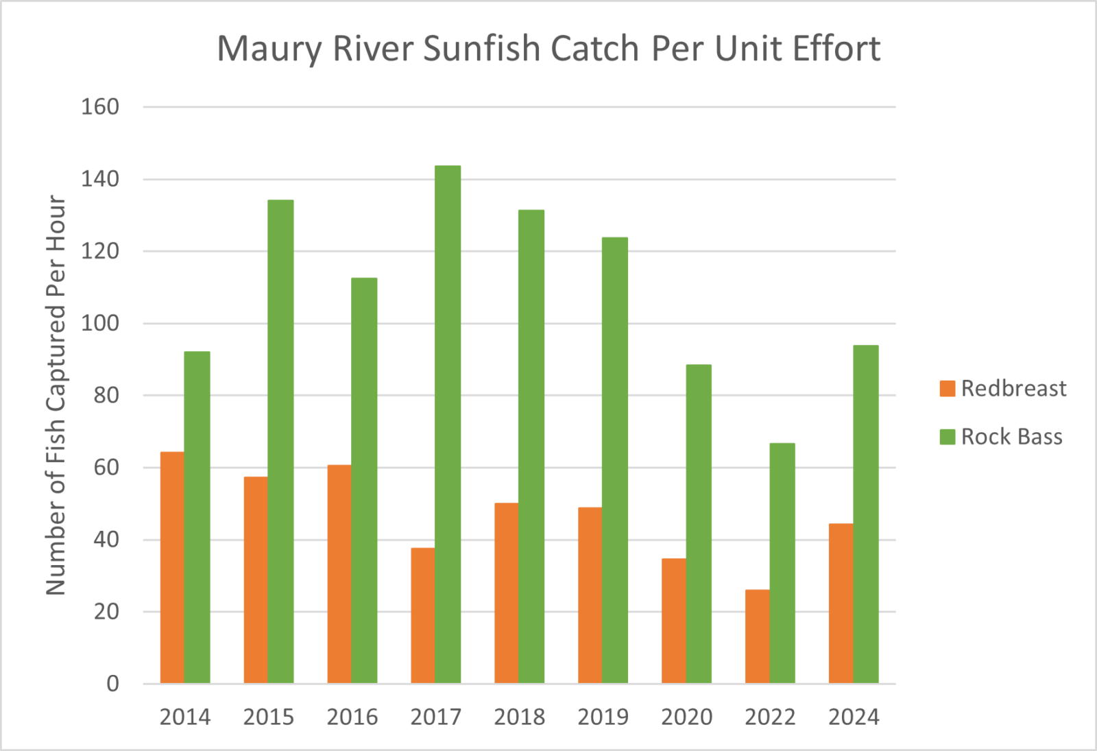 نهر موري هو أحد أكثر الأنهار ثباتًا في الولاية من حيث إنتاج سمك القاروس الصغير. لقد شهدنا انخفاضًا طفيفًا في معدل الصيد هذا الربيع، ولكن يمكن أن يعزى ذلك إلى حد كبير إلى انخفاض المياه بشكل استثنائي. تميل الأسماك إلى تجنب الصيد عندما تكون المياه صافية وتتجه إلى المياه العميقة حيث تكون بعيدة عن متناول أيدينا. بغض النظر عن ذلك، كان معدل الصيد لدينا ضمن المتوسط على المدى الطويل (الشكل 1).