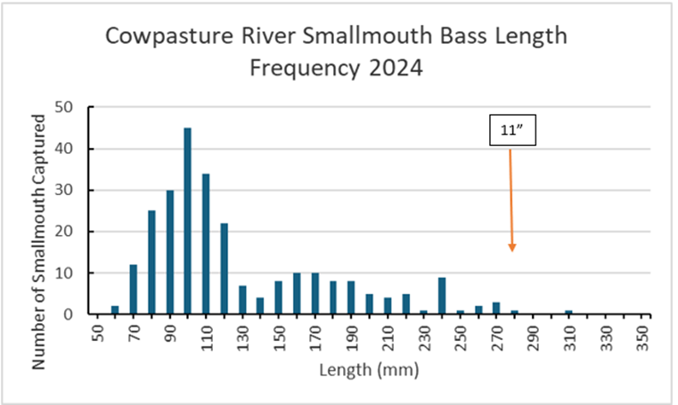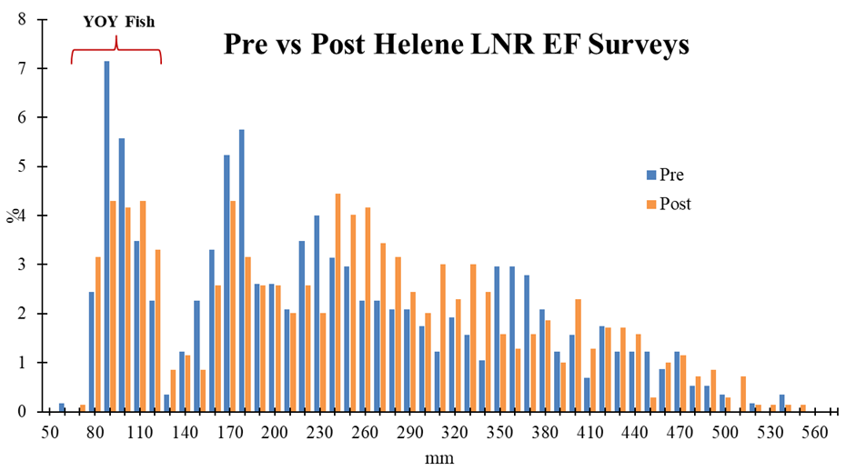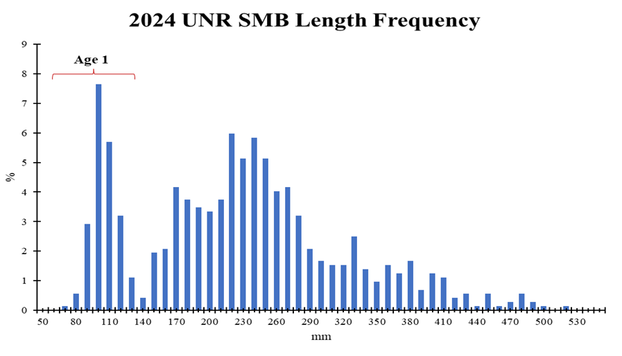 رسم بياني لتواتر أطوال الأسماك التي تم جمعها من خلال مسوحات الصيد الكهربائي 2024 الخريفية في النهر الجديد الأدنى. تشير الذروة الأولى إلى وجود أعداد جيدة من الأسماك من فئة 2024- سنة قبل وبعد إعصار هيلين.