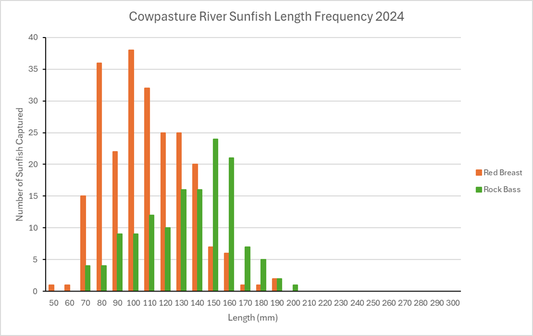 خلال أخذ عينات طوافتنا الربيعية 2024 جمعنا 659 سمك القاروس الصغير خلال ثلاث رحلات عائمة 6ميل تقع في الجزء العلوي (من مطحنة ألون إلى بينز بوتوم)، والوسطى (من جوردان بوينت إلى بن سالم وايزايد)، والسفلى (من حديقة غلين موري إلى سبيلر لوك) من نهر موري. كان حجم ما يقرب من 28 في المائة من أسماك الفلم الصغير 11 بوصة أو أكبر مع 9 في المائة منها 14 بوصة. قمنا باصطياد أعداد قليلة من الأسماك التي لا تنسى حيث بلغ قياس 2 فقط 17+ بوصة. يجب أن يتوقع الصيادون صيد أعداد جيدة من الأسماك تتراوح بين 7-13 بوصة. ومقارنةً بالأنهار الأخرى ذات الحجم المماثل، يميل نهر موري إلى إيواء أعداد أكبر من الأسماك ذات الحجم الجيد، والتي توجد عادةً في الروافد السفلى من ليكسينغتون إلى مصب نهر جيمس. ومع ذلك، فقد فوجئنا بسرور بعدد 11+ بوصة من الأسماك التي صادفناها في الأقسام العليا. داخل الموقع العلوي، احتوت 27 في المائة من عينة الأسماك البالغة على أسماك تزيد عن 11 بوصة، وهي زيادة ملحوظة عن آخر مرة تم فيها أخذ العينات.