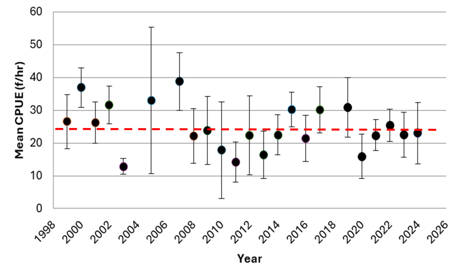من المتوقع أن يستمر صيد سمك القاروس الصغير في نهر ستونتون في 2025 من متوسط إلى جيد. في حين أن الفئتين السنويتين 2023 و 2024(تقاس بكثافة صغار سمك القاروس في عيناتنا) كانتا أقل من المتوسط، إلا أن الفئات السنوية الأفضل من المتوسط المنتجة في 2017 و 2019 و 2021 و 2022 ستحافظ على معدلات صيد ثابتة من الأسماك عالية الجودة لعدة سنوات قادمة. تُظهر معدلات الصيد في الخريف، تُظهر عينات الأسماك الكهربائية أن كثافة الأسماك في العقد الماضي كانت في المتوسط أو أعلى من المتوسط ومن بين أفضل معدلات الصيد في 25 سنة (انظر الرسم البياني أدناه). 2016- و 2020كانت الفئتان السنويتان ضعيفتان/متوسطتان وكان هطول الأمطار الغزيرة والتدفقات الشديدة في 2018 من المحتمل أن تكون قد أدت إلى إضافة القليل من الأسماك إلى مصايد الأسماك في تلك السنة. 2023- و 2024-كانت فصول السنة الدراسية أيضًا أقل بقليل من المتوسط، لذلك هناك حاجة بالتأكيد إلى فصل عام جيد.