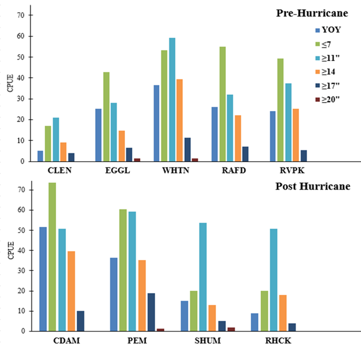 معدلات صيد سمك القاروص الصغير في خريف EF EF حسب الموقع أسفل سد كلايتور. يصور الرسم البياني العلوي المسوحات التي أجريت قبل إعصار هيلين، بينما يصور الرسم البياني السفلي المسوحات التي تم إنجازها بعد الإعصار بحوالي 1 شهر تقريبًا.