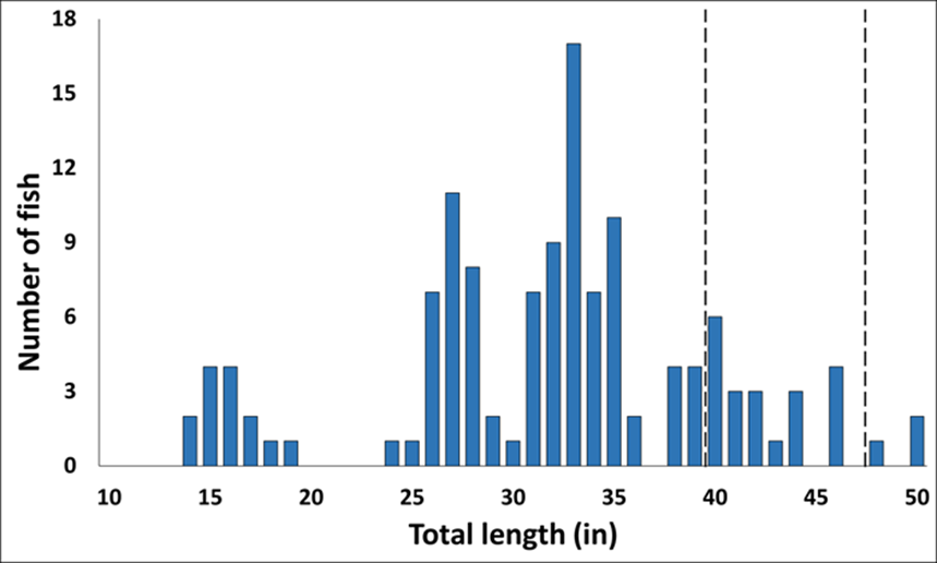 الصيد الكهربي الشتوي لسمك المسكي من نهر نيو ريفر السفلي في 2024. تمثل الخطوط المتقطعة أسماك ضمن حدود الفتحة المحمية 40-48".