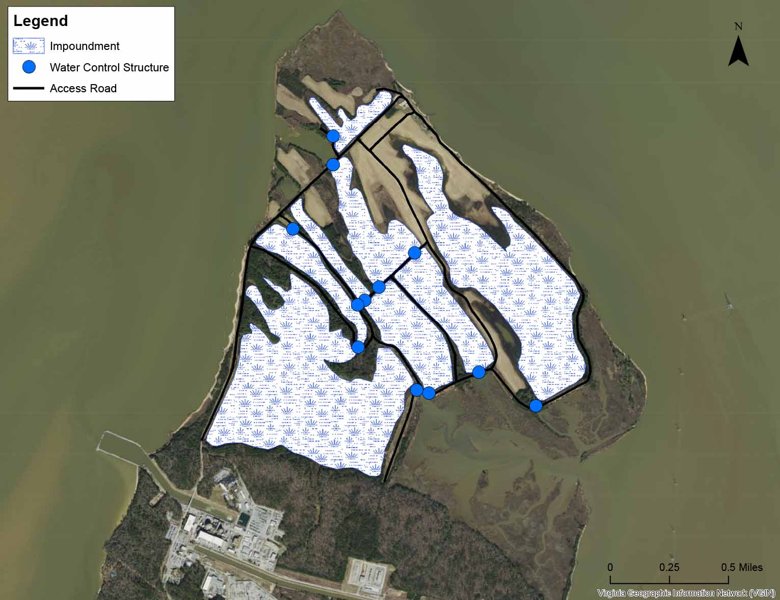 تستخدم إدارة موارد الحياة البرية في فيرجينيا (DWR) العديد من تقنيات الإدارة في جزيرة هوغ لضمان استمرار المنطقة في توفير موطن وموارد غذائية وافرة للعديد من أنواع الحياة البرية التي تعتمد على هذه المنطقة الفريدة. تحتوي جزيرة هوج آيلاند على سلسلة من السدود المنخفضة التي تتضاعف كطرق وصول، والتي تخلق ثماني وحدات مستقلة من الأراضي الرطبة، والمعروفة باسم مستودعات المياه. تنفذ وزارة الموارد المائية والري إدارة التربة الرطبة داخل المستودعات للتأثير على نمو النباتات وتوفير موطن جيد للطيور المائية. وتشمل أنشطة الإدارة الأخرى الزراعة الزراعية لإفادة الحياة البرية، ومكافحة الأنواع الغازية، وترميم الشواطئ الحية لمكافحة التآكل. اقرأ الأقسام أدناه لمعرفة المزيد عن تقنيات الإدارة المختلفة المستخدمة في العقار.