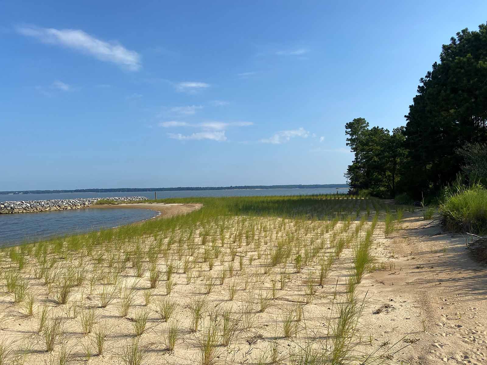 الشواطئ هي بيئات ديناميكية تتأثر تدريجيًا بارتفاع مستويات سطح البحر ويمكن أن تتغير بشكل كبير بعد موجة العاصفة. الارتفاع غير الطبيعي في مستوى مياه البحر أثناء العاصفة، ويقاس بارتفاع المياه فوق المد الفلكي الطبيعي المتوقع. . تعتبر الشواطئ في جزيرة هوغ معرضة بشكل خاص للخسارة أثناء العواصف بسبب الجلب الكبير. Fetch هي مسافة المياه المفتوحة التي يمكن أن تهب الرياح عبرها. عبر مصب نهر جيمس. يمكن أن تخلق المياه المرتفعة بشكل غير عادي والرياح القوية التي تهب عبر نقطة جلب كبيرة موجات قوية تتصادم على طول الشواطئ وتؤدي إلى تآكلها. لا يؤثر فقدان الخط الساحلي في جزيرة هوج على البنية التحتية القائمة مثل المباني والطرق والسدود فحسب، بل يؤدي فقدان الخط الساحلي أيضًا إلى إضافة العناصر الغذائية الزائدة والرواسب إلى Chesapeake مما يزيد من العكارة ويؤثر على جودة المياه.