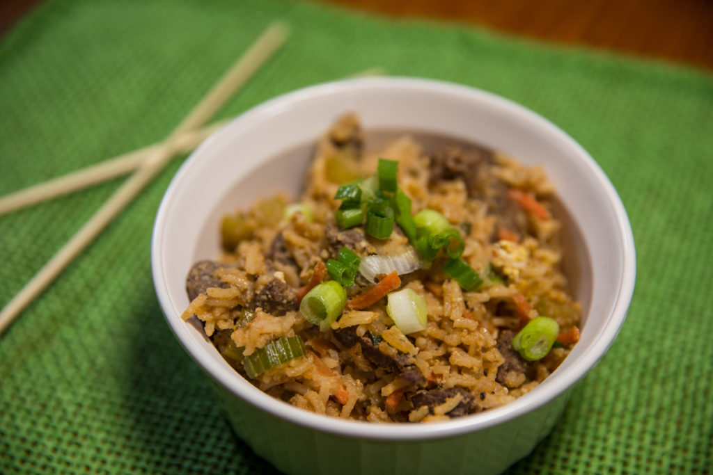 - توضع شريحة اللحم في المقلاة على نار متوسطة مع زيت الزيتون والثوم المفروم. أثناء طهي شريحة اللحم، يُطهى الأرز في قدر حسب العبوة.
