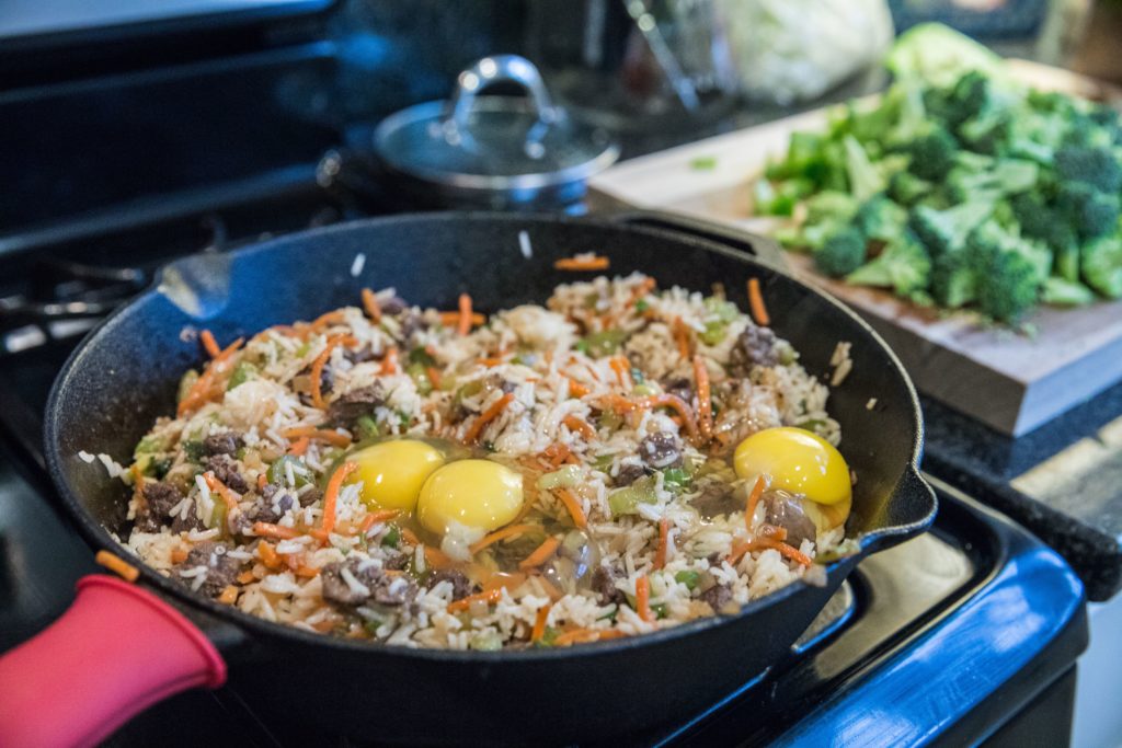 - يُخلط البيض في مقلاة منفصلة أو في نفس المقلاة مع جميع المكونات الأخرى. (كلتا الحالتين مناسبة، ولكنني وجدت أنه من الأسهل خلط البيض بشكل منفصل ثم خلطه مع المكونات الأخرى).