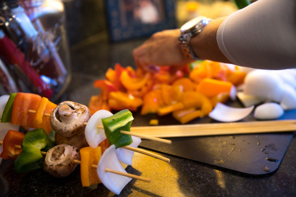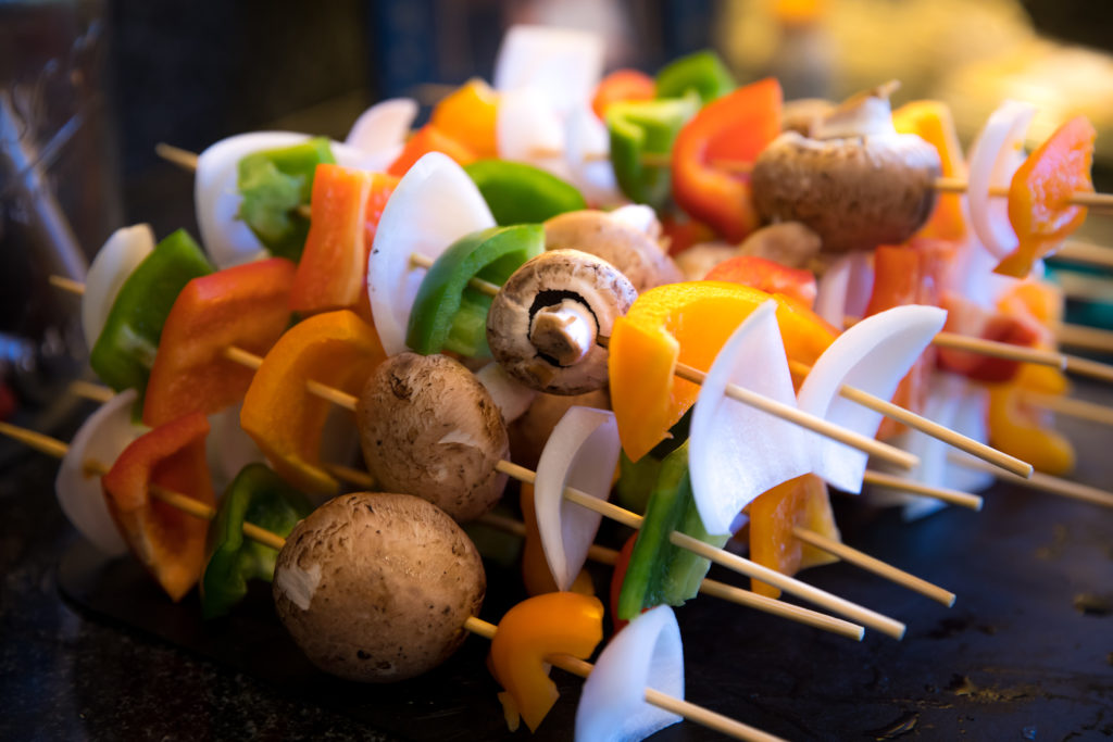 - تُضاف جميع الخضروات إلى أعواد الكباب وتُدهن بزيت الزيتون. يُرش الكباب بالتوابل الإيطالية ومسحوق الثوم والملح والفلفل.