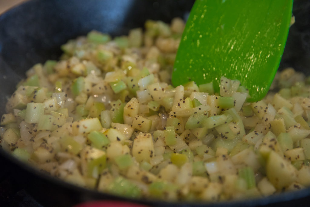 - يُطهى البصل والكرفس والتفاح في مقلاة مع الزبدة حتى يلين. تُضاف إلى النقانق عند نضجها.