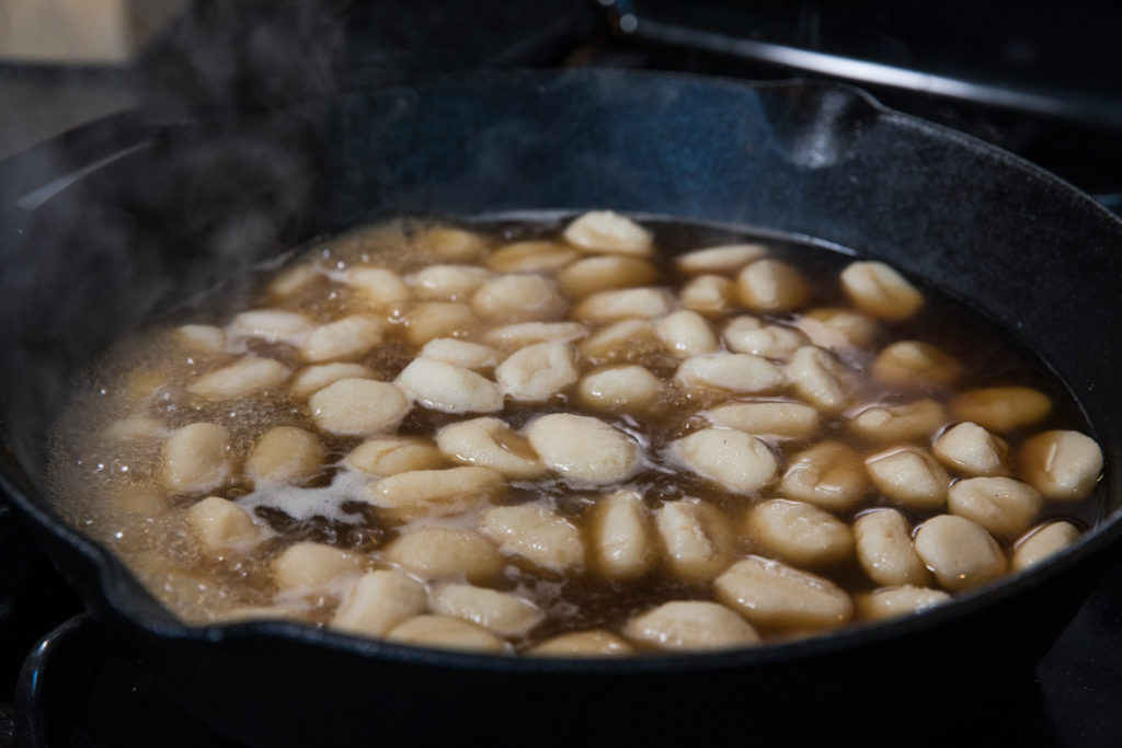 - في نفس المقلاة يُطهى نقانق لحم الغزال في نفس المقلاة إِلى أن يصبح لونها بني.