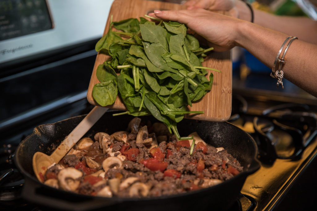 - يُضاف السبانخ ويُقلب حتى يتجانس.