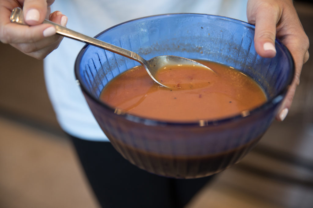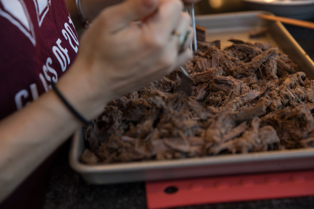 - اسحب اللحم المشوي حتى يتم تقطيعه بالكامل وأضف صلصة الشواء. يُخلط جيداً مع اللحم المبشور. يُترك على نار هادئة لبضع ساعات.