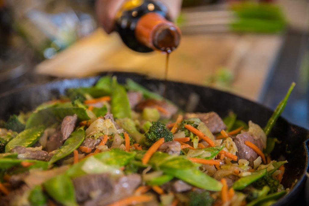- أضِف لحم المتن إلى المقلاة واستمر في تقليب المكونات حتى تمتزج جيدًا على نار متوسطة منخفضة. أضف المزيد من الترياكي وصلصة الصويا والتوابل حسب رغبتك.