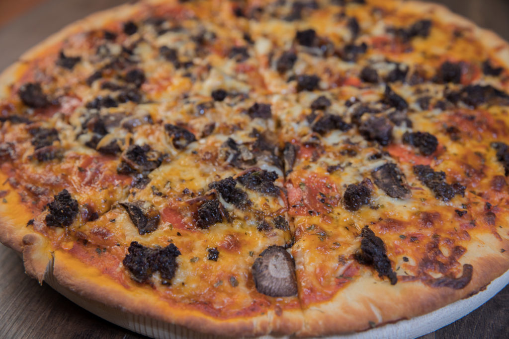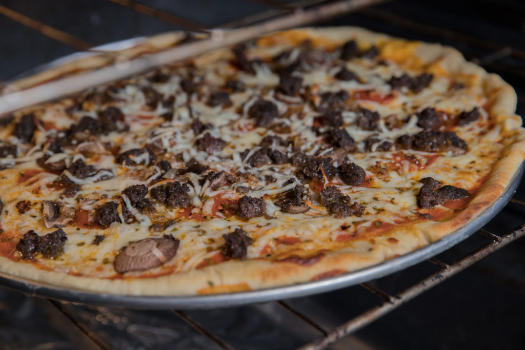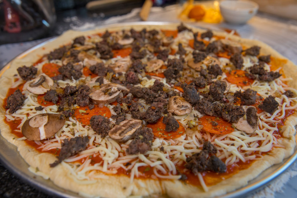 - عندما يتم تشكيل العجينة وفردها، تُغطى صينية بزيت الزيتون وتوضع العجينة على الصينية. تُغطى العجينة بصلصة البيتزا وتُغطى بجبنة الموزاريلا بكثافة.