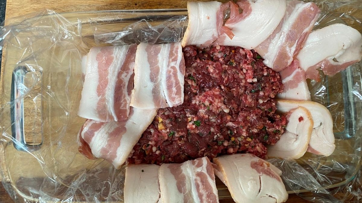 6. يُضغط حوالي بوصة من مزيج اللحم المتبل في طبقة اللحم المقدد