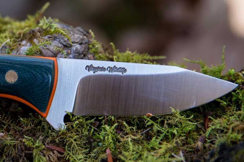 2.5. " شفرة من الفولاذ المقاوم للصدأ AEB-L، معالج بالتبريد إلى 59 صلابة روكويل. يظهر على أحد الوجهين عبارة "فيرجينيا وايلدلايف"، بينما يظهر على الوجه الآخر شعار "انضم أو مت".