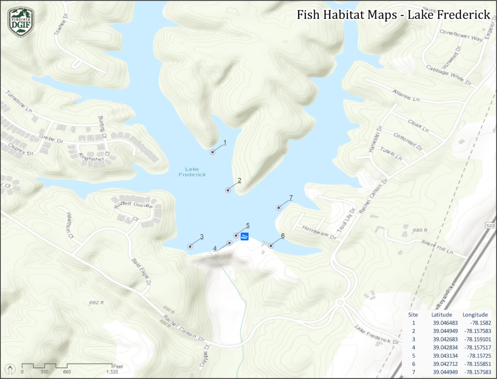 بحيرة فريدريك عبارة عن مستودع مساحته 117فدان مملوك لوزارة موارد الحياة البرية في فرجينيا. استحوذت الإدارة على البحيرة وحاجزًا عازلًا بطول خمسين قدمًا حول الشاطئ بأكمله في 1981. تظل بحيرة فريدريك صافية على مدار العام وتتكون طبقاتها من خط حراري خلال أشهر الصيف. يبلغ أقصى عمق للبحيرة 50 قدم ومتوسط العمق 20 قدم. يحتوي جزء كبير من الخط الساحلي والأطراف العلوية من الجسرين على أخشاب مغمورة قائمة. وعادةً ما تقع الأخشاب الراكدة على طول الخط الساحلي على بعد حوالي خمسة وعشرين قدماً من حافة المياه.