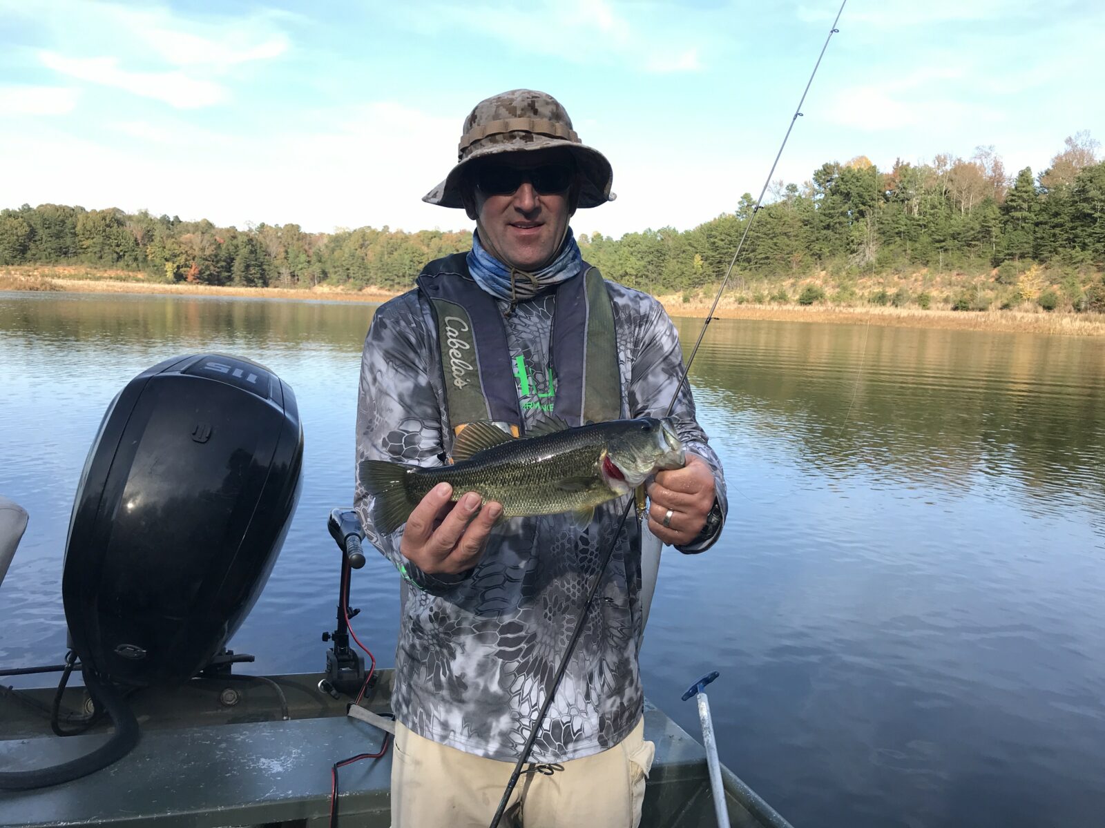 الصياد ديريك ميريكس مع سمكة باس مخطط اصطادها في خزان ليتل كريك.