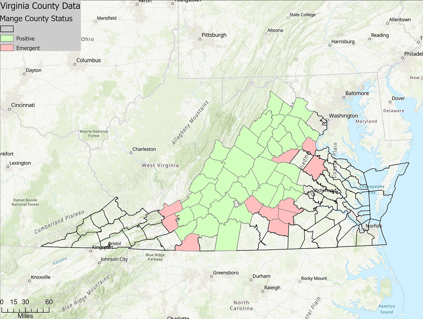 المقاطعات التي تعتبر إيجابية أو ناشئة لمرض الجرب في الدببة السوداء في ولاية فرجينيا (اعتبارًا من يناير 2026).