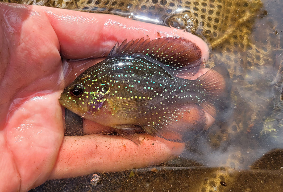 سمكة شمس زرقاء كبيرة مرقطة زرقاء اللون تم التقاطها خلال حدث لأخذ عينات من DWR.