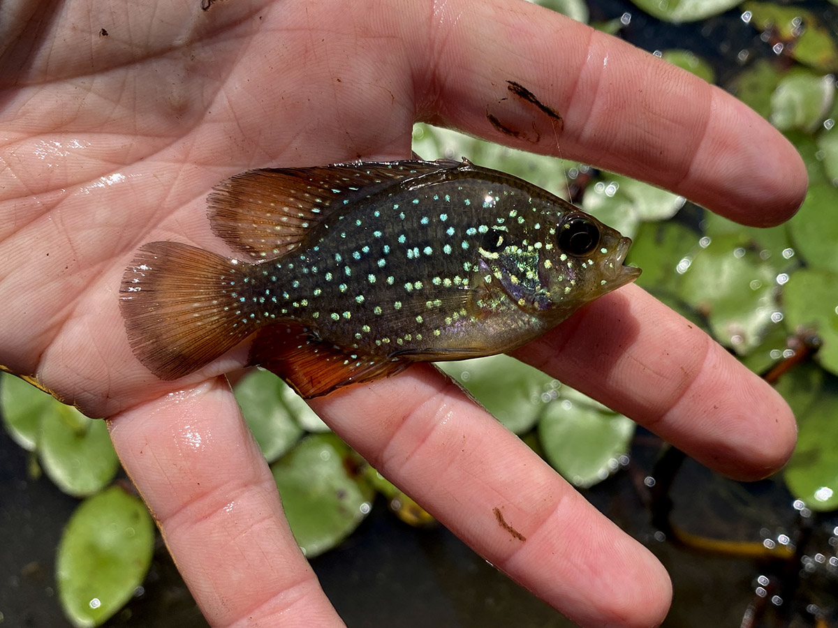 الحجم: نادرًا ما يتجاوز طول سمكة الشمس المرقطة الزرقاء 3 بوصة داخل مياه فيرجينيا