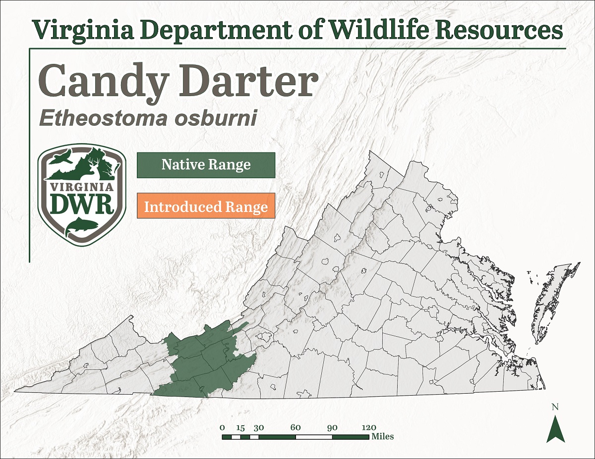 وداخل ولاية فيرجينيا، لا يستوطن كاندي دارتر إلا في حوض النهر الجديد في المنطقة الجنوبية الغربية من الولاية.