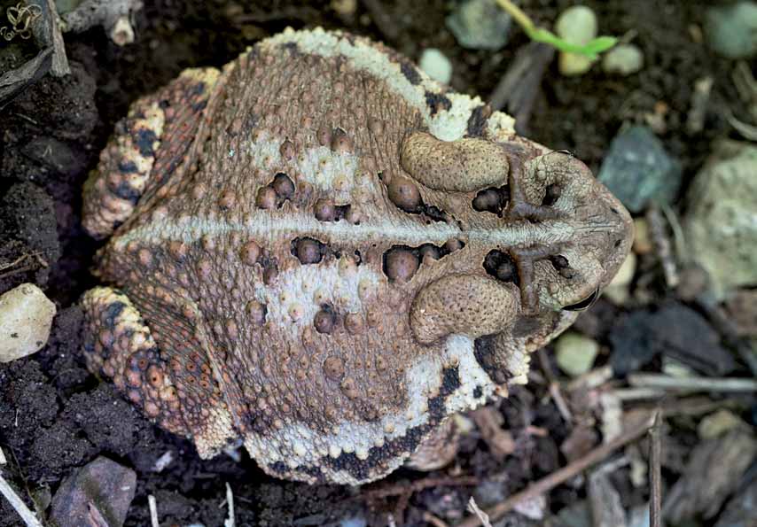 وهو ضفدع ثؤلولي كبير الحجم، وعادةً ما يكون له 1-2 ثآليل في كل بقعة لونية ظهرية، وعروق قحفية بارزة (انظر الصفحة 9)، وعمود فقري قصير فوق معظم الثؤلول الفخذي. اللون متغير للغاية، من الأحمر القرميدي إلى البني والرمادي الزيتوني إلى الرمادي الفاتح. يمكن رصد البطن أو لا.