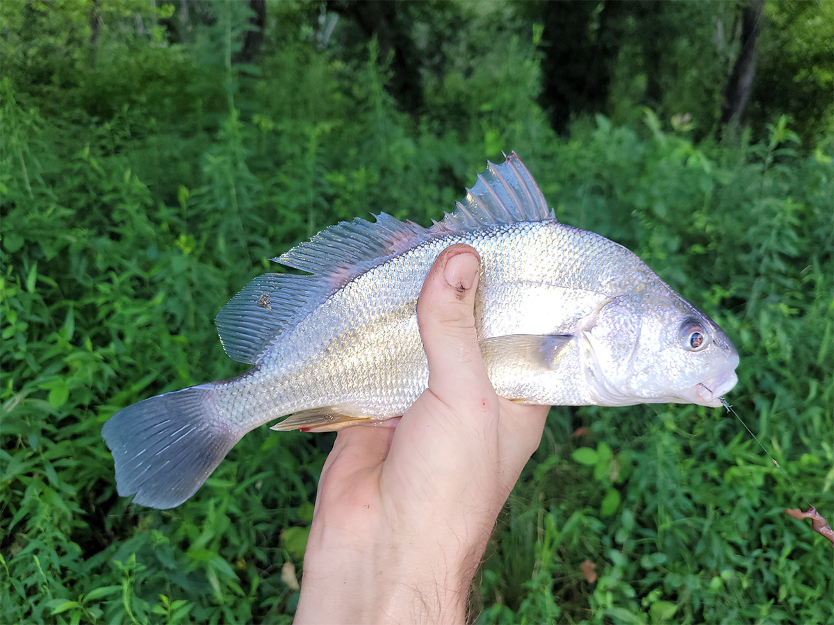 صياد يستعرض سمكة طبل المياه العذبة الصغيرة. الصورة من ©تيم ألدريدج