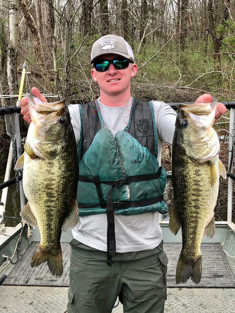 عالما الأحياء في مصايد الأسماك في المنطقة الرابعة مايك إيزل وروبي ويليس يستعرضان زوجين من أسماك الباس الكبير الذي تم جمعه خلال فعالية لأخذ العينات.