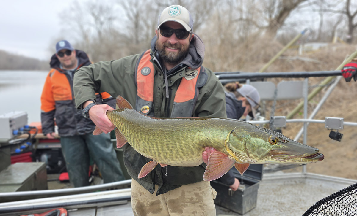 عالم الأحياء السمكية تايلر يونغ مع مسكي كبير تم صيده أثناء الصيد. صورة © من تصوير ميغان ماركيتي - DWR