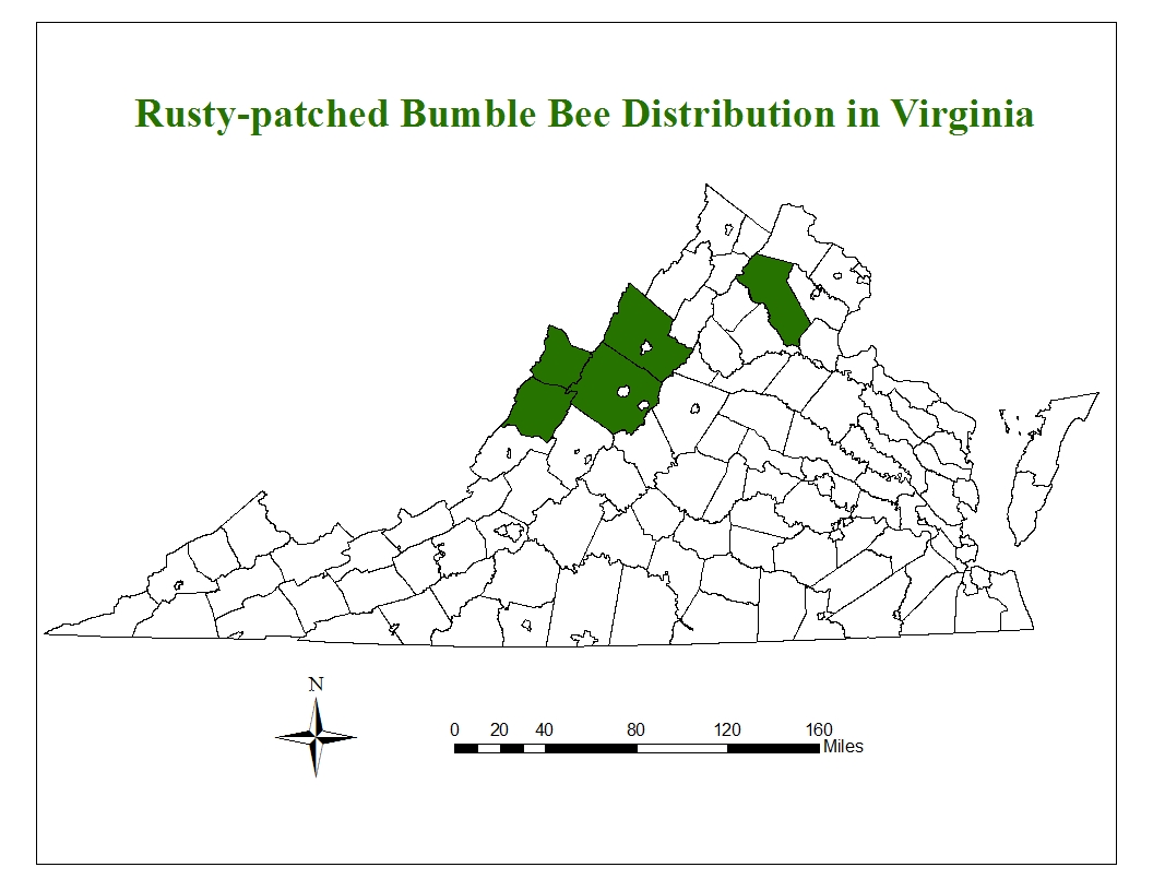 النحل الطنان المرقط الصدئ معروف حاليًا في خمس مقاطعات فقط في فيرجينيا: فوكوير، وأوغوستا، وباث، وهايلاند، وروكينجهام. أما المقاطعات الأربع الأخيرة، وهي المقاطعات الغربية الأكثر وفرة في المقاطعات الأربع الأخيرة، مما يجعلها أفضل رهان للعثور على النحلة. ومع ذلك، حتى داخل تلك المقاطعات، فإن أعدادها منخفضة للغاية، مما يجعل من النادر جداً اكتشافها.